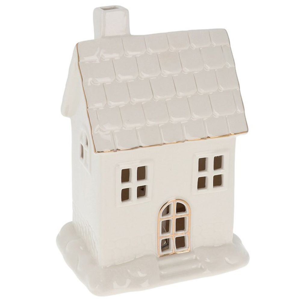 Valkoinen talolyhty, jossa sisäänrakennetut led-valot. Kauniisti muotoiltu keraaminen lyhty ihastuttaa yksityiskohdillaan ja kullanvärisillä somisteilla.
