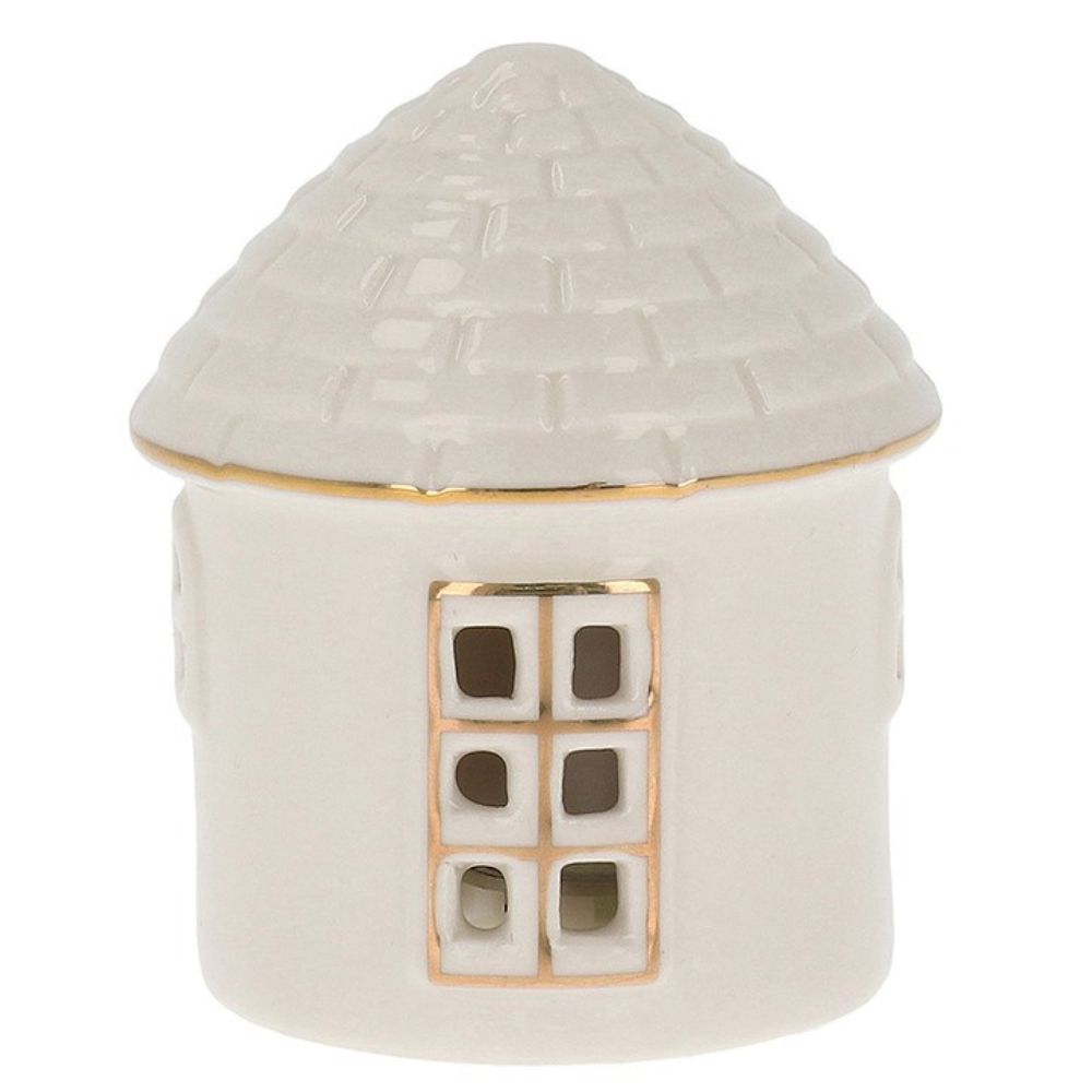 Pieni valkoinen talolyhty, jossa LED-valo. Suloisen pyöreä lyhty hurmaa yksinkertaisella muotoilullaan ja kauniilla kultaisilla yksityiskohdillaan. Kompakti koko tekee siitä täydellisen koristeen esimerkiksi hyllylle tai ikkunalaudalle.