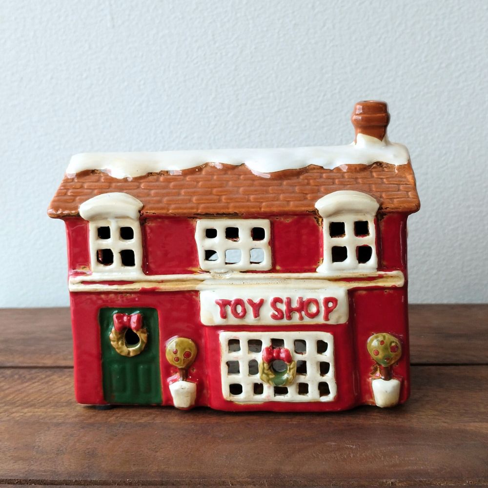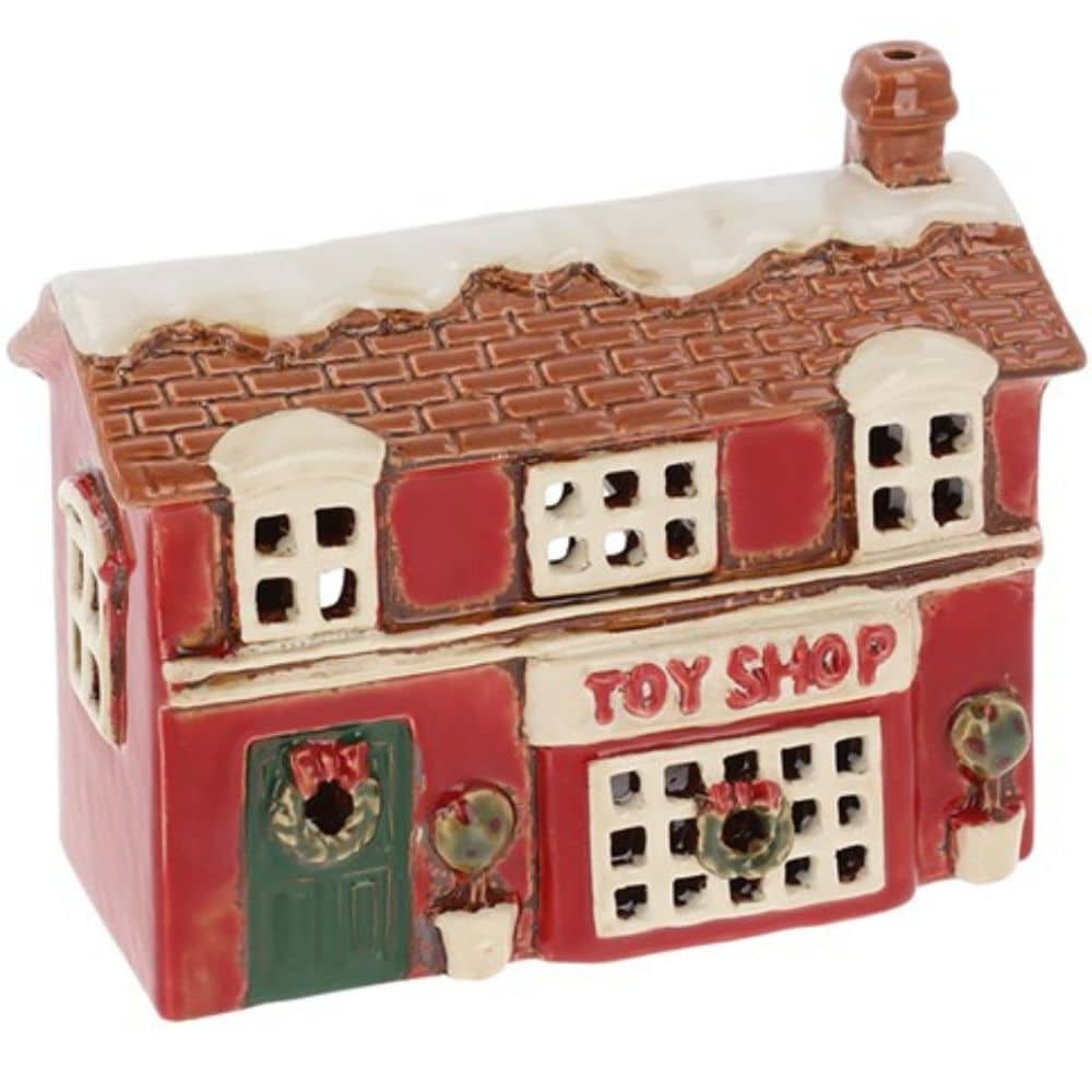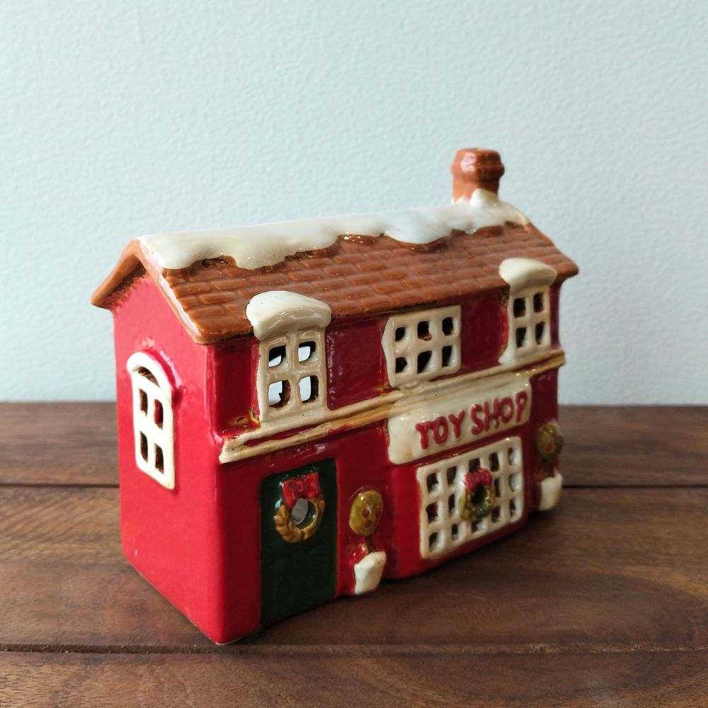 Punainen talolyhty, joka on täynnä suloisia yksityiskohtia! Keraamisessa talolyhdyssä on luminen tiilikatto, punaiset seinät ja ikkunan yllä kyltti “Toy Shop”. Suloinen lelukauppa-lyhty on ihastuttava sisustusesine, joka toimii myös lyhtynä.
