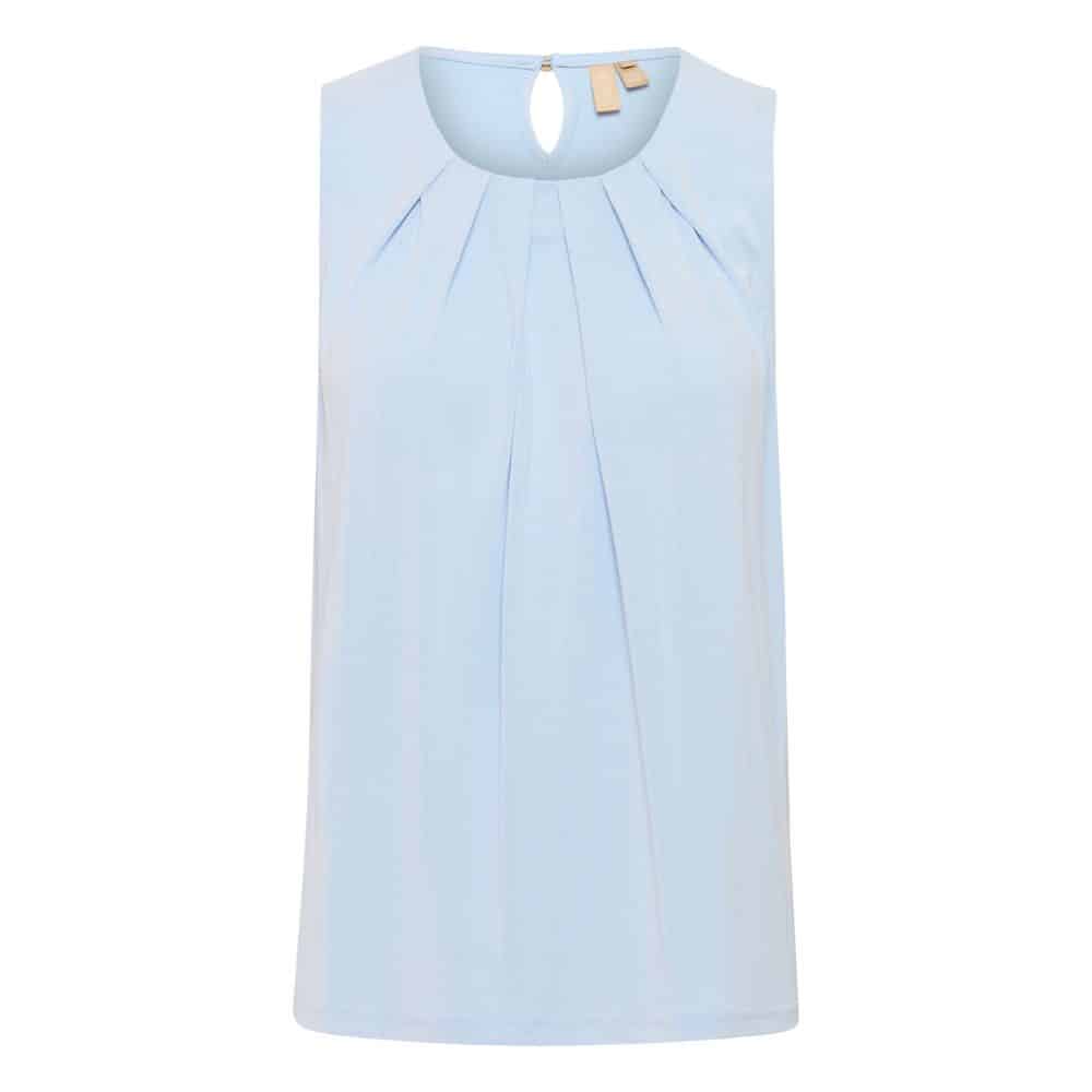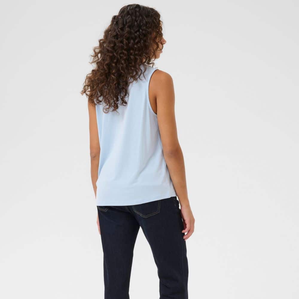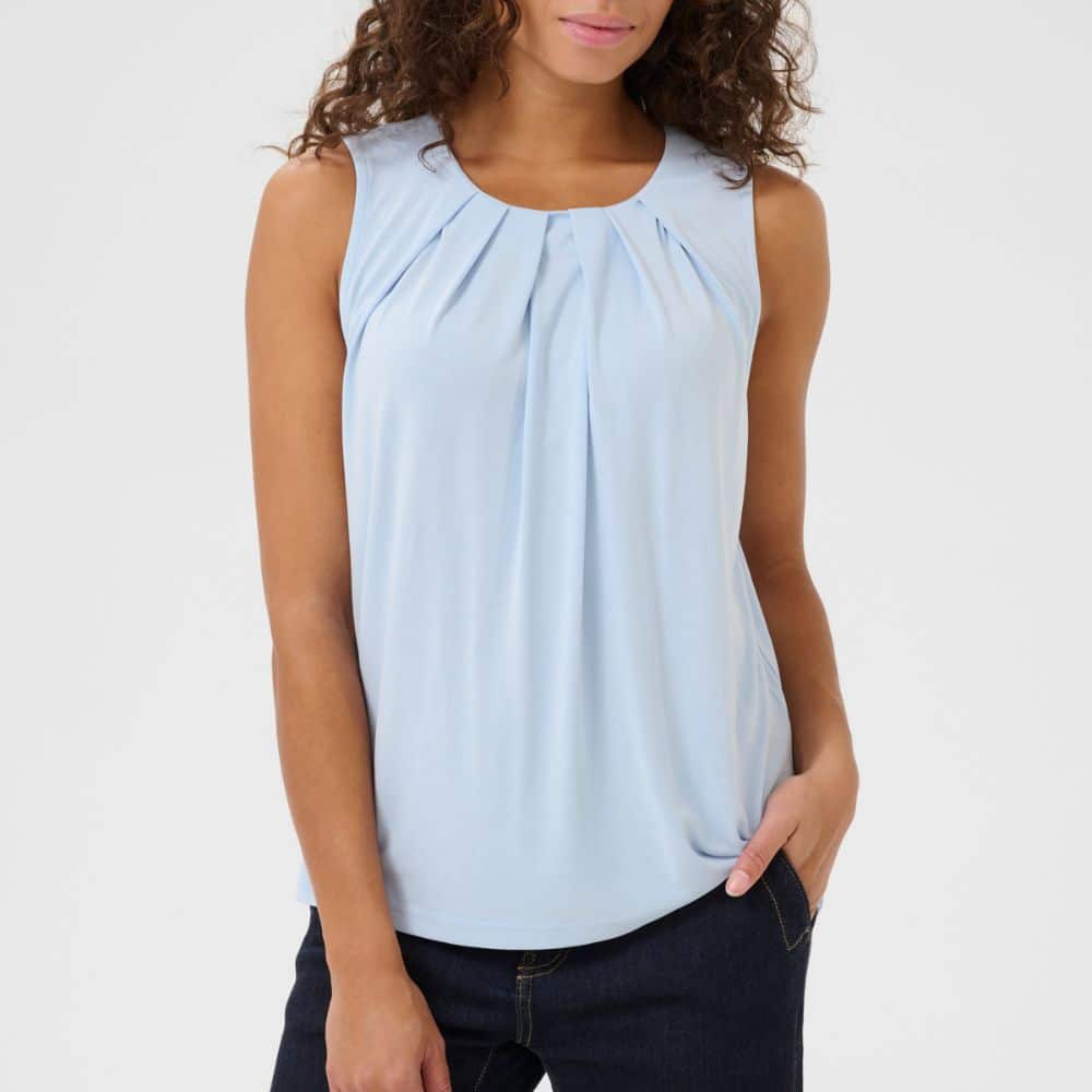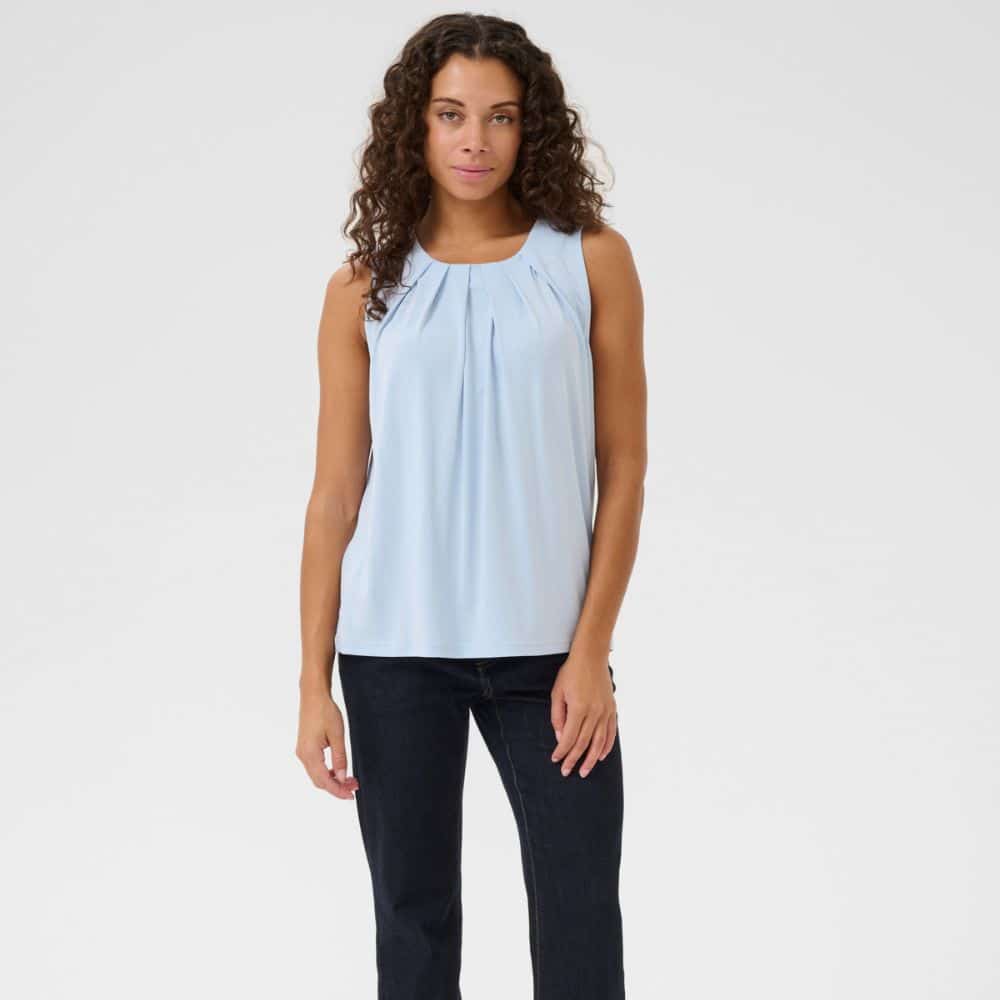 Culture – vaaleansininen toppi on kevyt ja kauniisti laskeutuva valinta lämpimiin päiviin. Hihaton malli ja pehmeä sävy tekevät siitä helposti yhdisteltävän osan kesäpukeutumista. Pääntien hieno vekitys tuo toppiin huolitellun ilmeen.