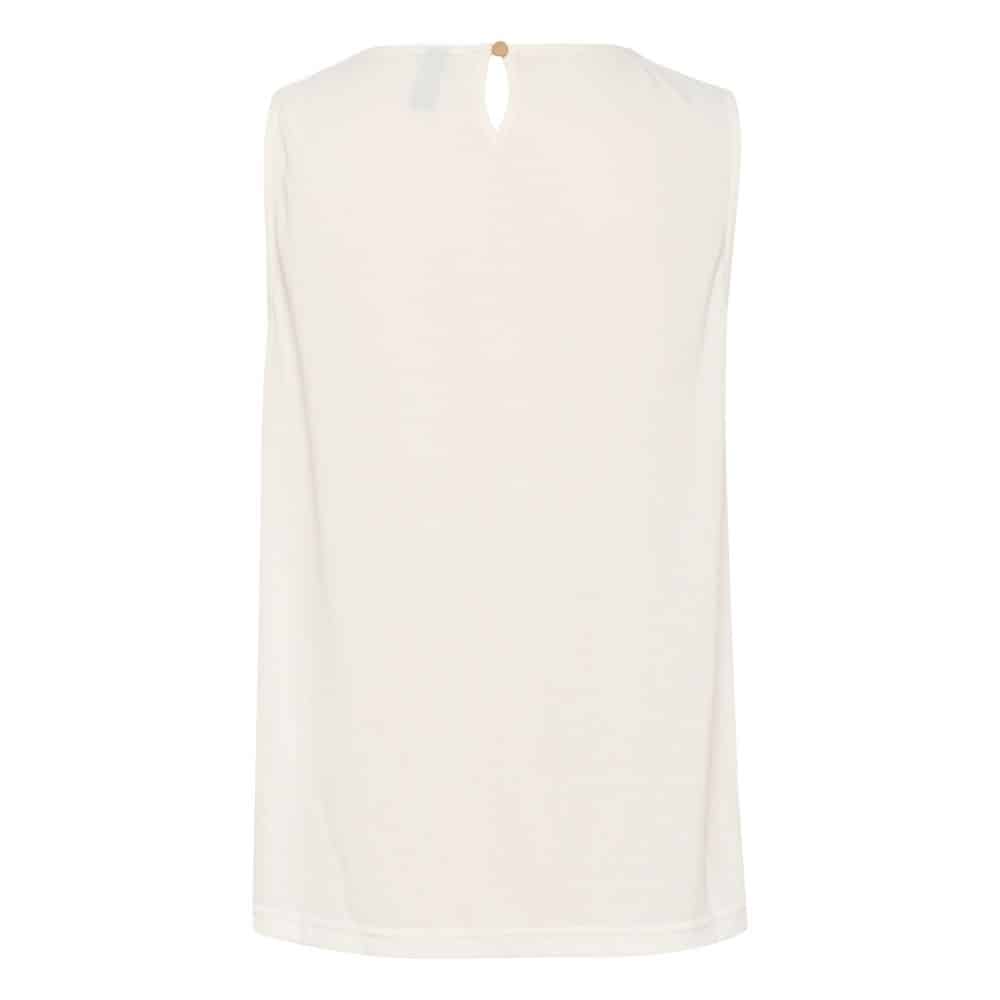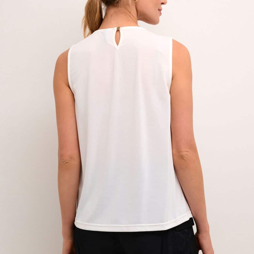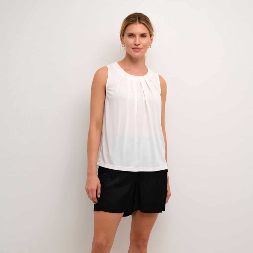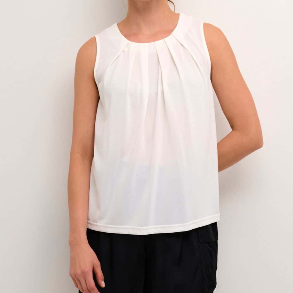 Culture – valkoinen toppi on ajaton ja raikas valinta lämpimiin päiviin. Hihaton malli ja kauniisti laskeutuva kangas tekevät siitä miellyttävän käyttää. Pääntien hieno vekitys tuo yksinkertaiseen toppiin ilmettä.