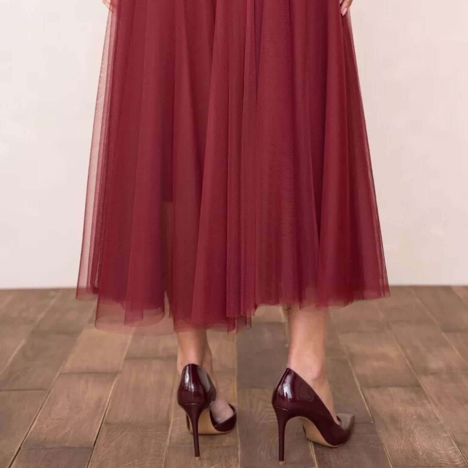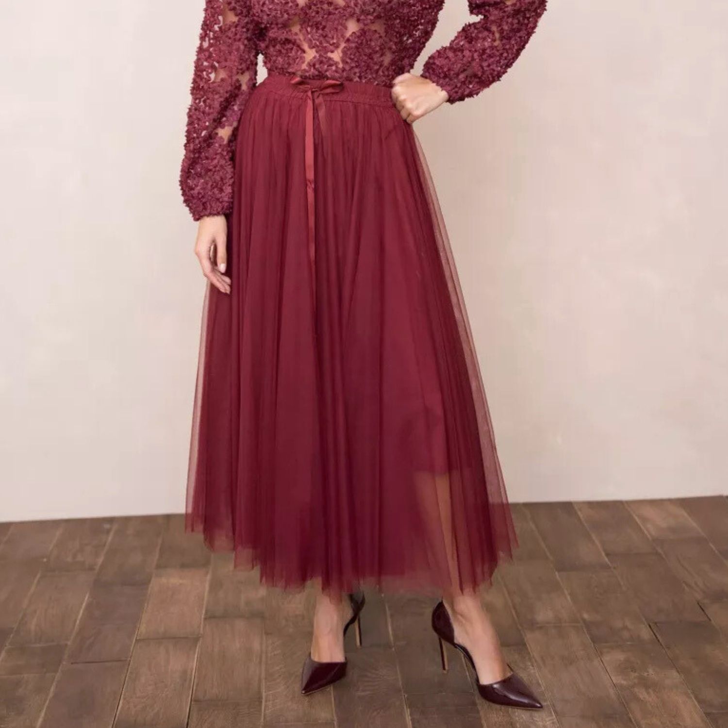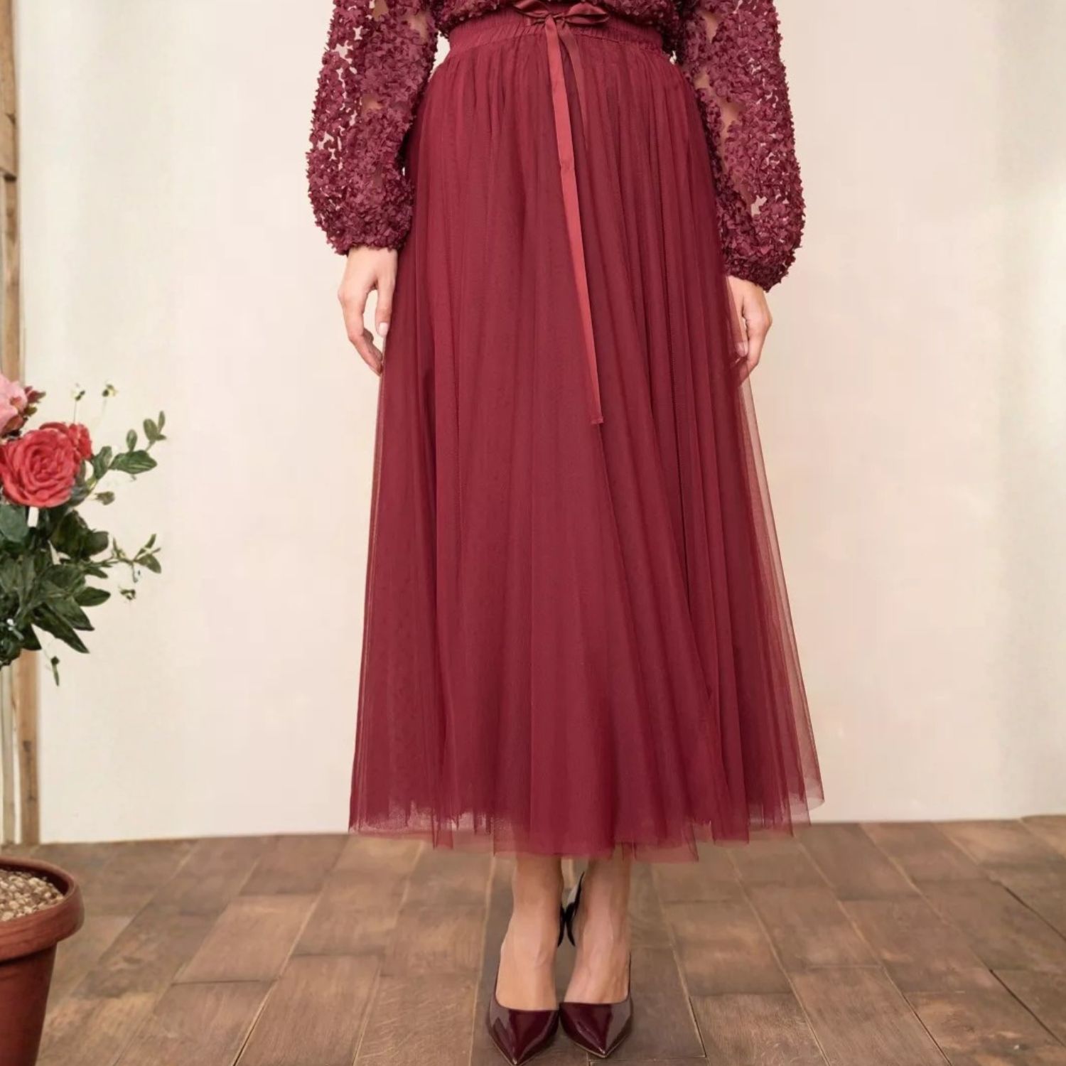 Burgundin punainen tyllihame on erittäin miellyttävä päällä sen joustavan kuminauhavyötärön ansiosta. Hame laskeutuu kauniisti ja se liikkuu imartelevasti liikkeen mukana. Vyötäröllä on koristeena satiininauhat, jotka voit solmia rusetille.