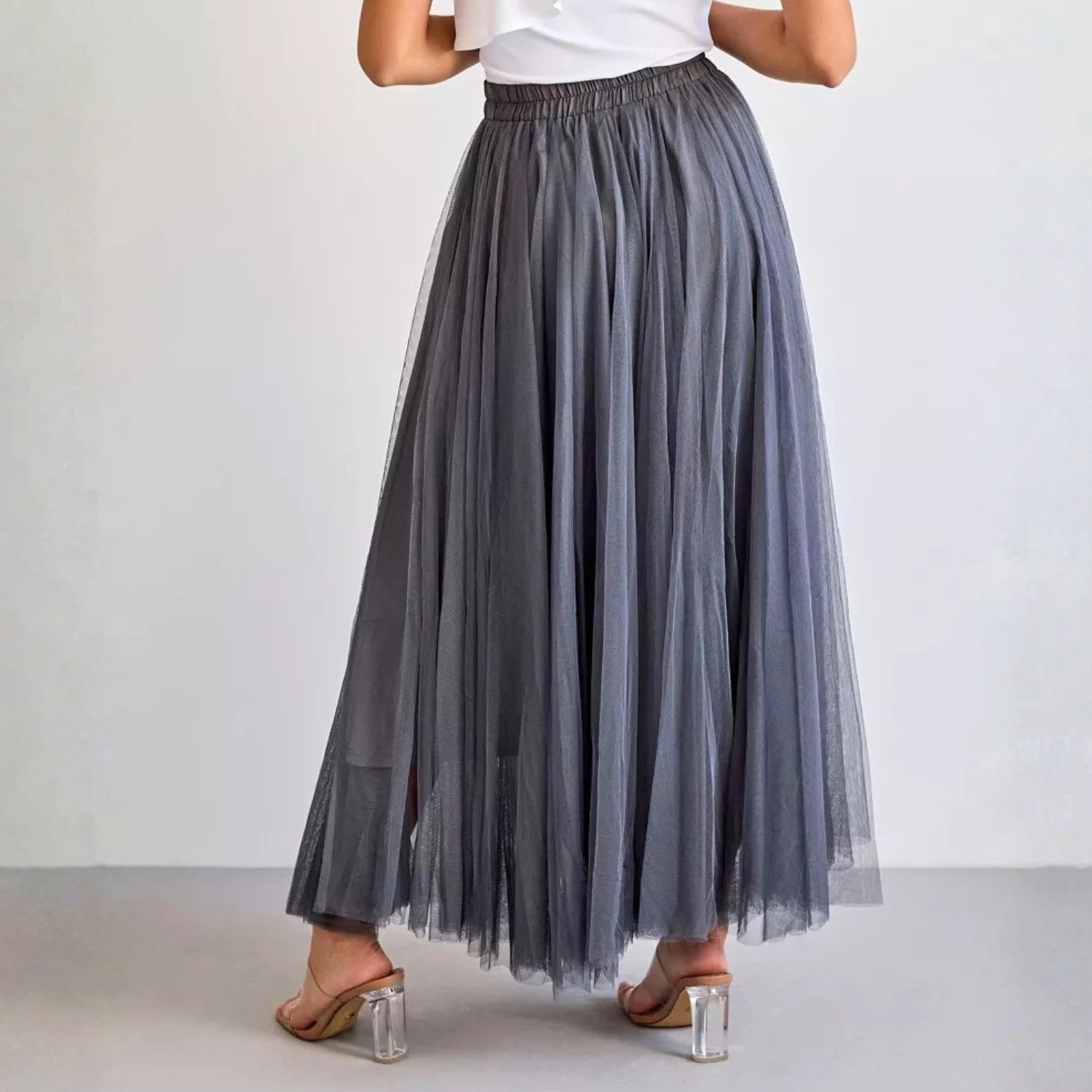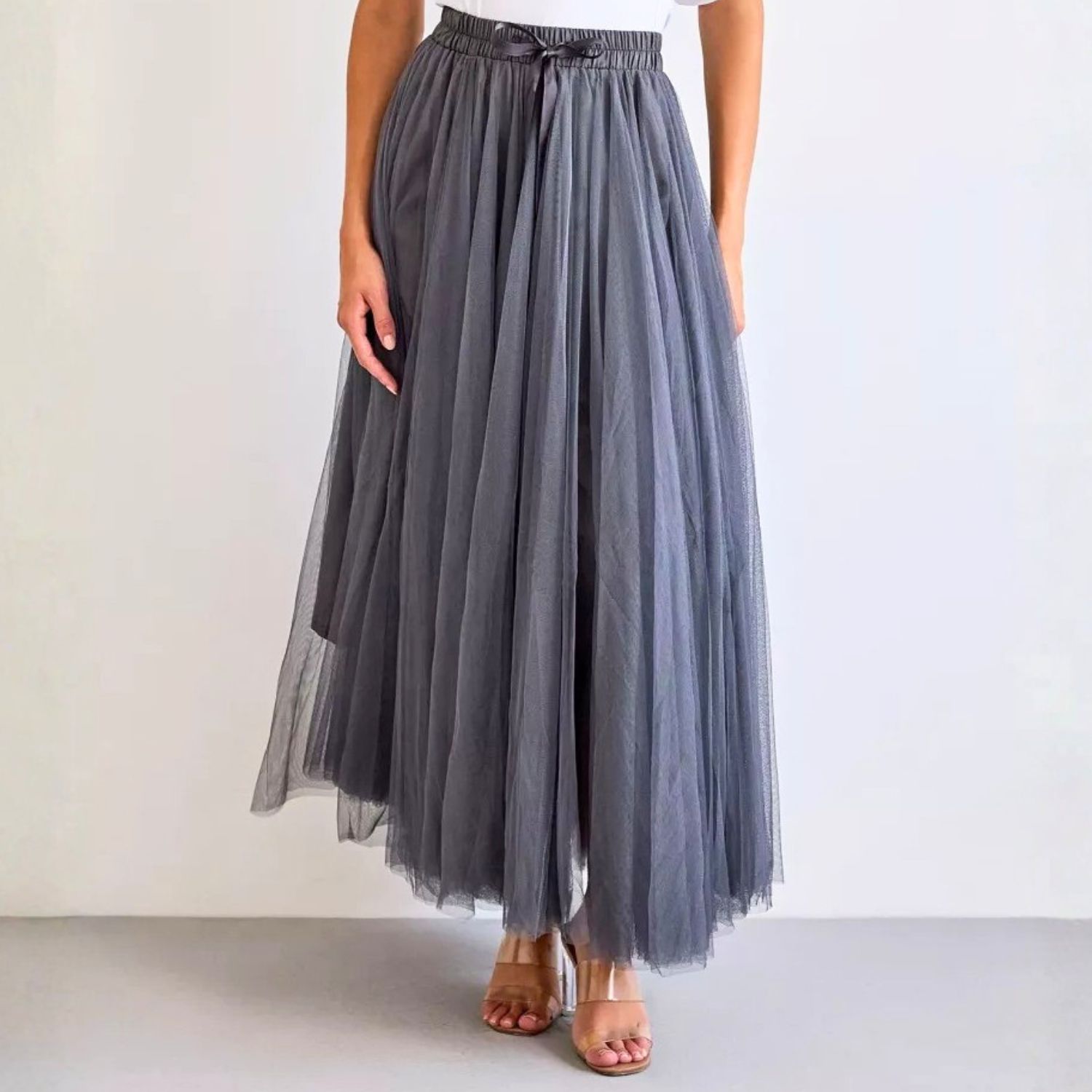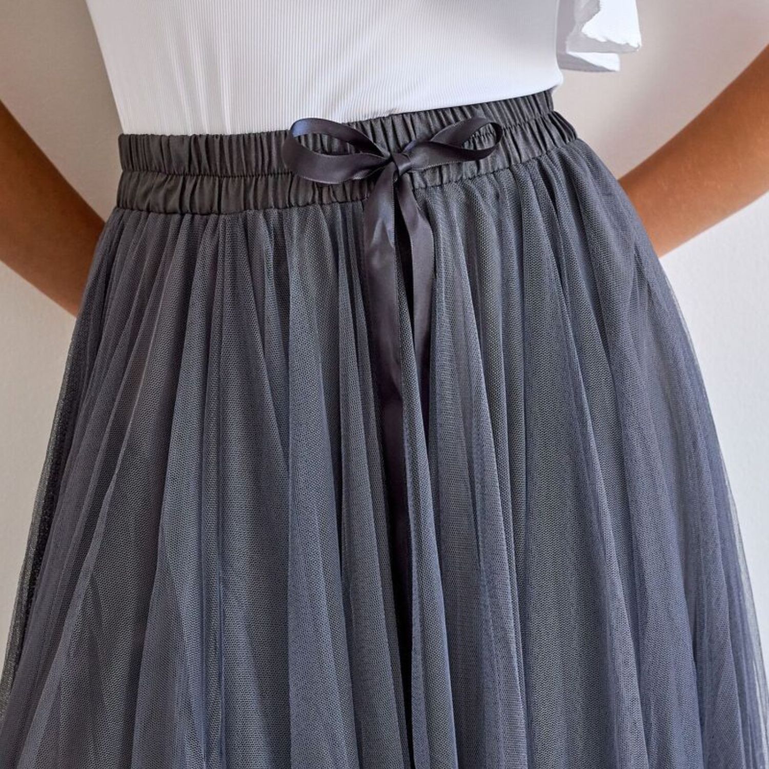 Harmaa tyllihame on erittäin miellyttävä päällä sen joustavan kuminauhavyötärön ansiosta. Hame laskeutuu kauniisti ja se liikkuu imartelevasti liikkeen mukana. Vyötäröllä on koristeena satiininauhat, jotka voit solmia rusetille. Yhdistä hameeseen herkkää pitsiä, rouheaa nahkaa tai himmeästi kiiltävä satiinipaita.