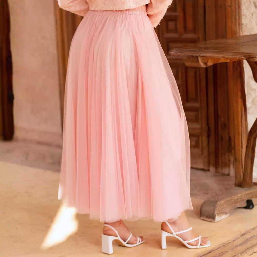 Vaaleanpunainen tyllihame , jossa upeasti laskeutuva pitkä helma ja mukava kuminauhavyötärö. Runsas tylli luo kauniin naisellisen siluetin. Näyttävä tyllihame sopii niin arkisempiin menoihin kuin hienoon juhlaan!