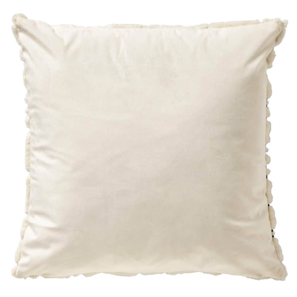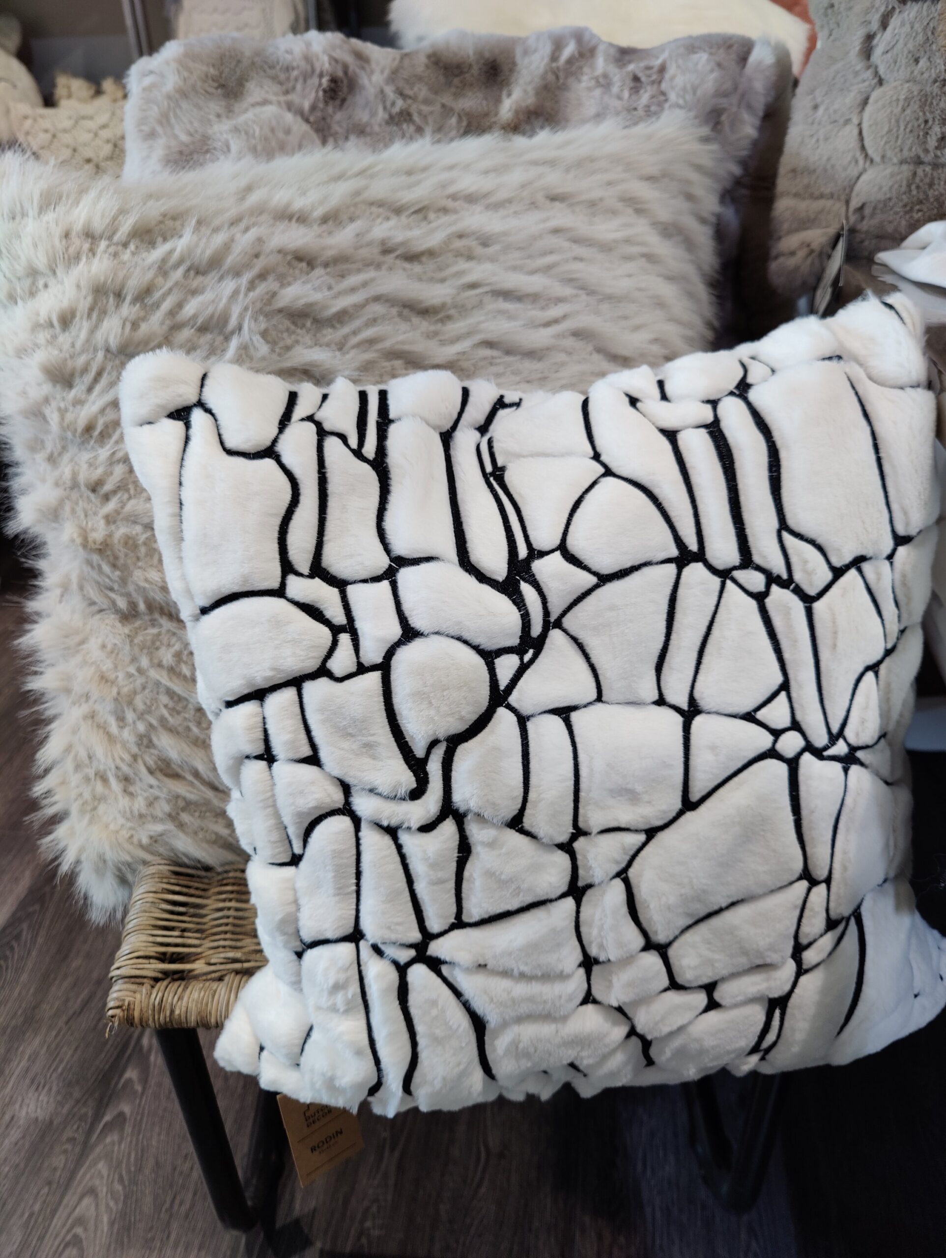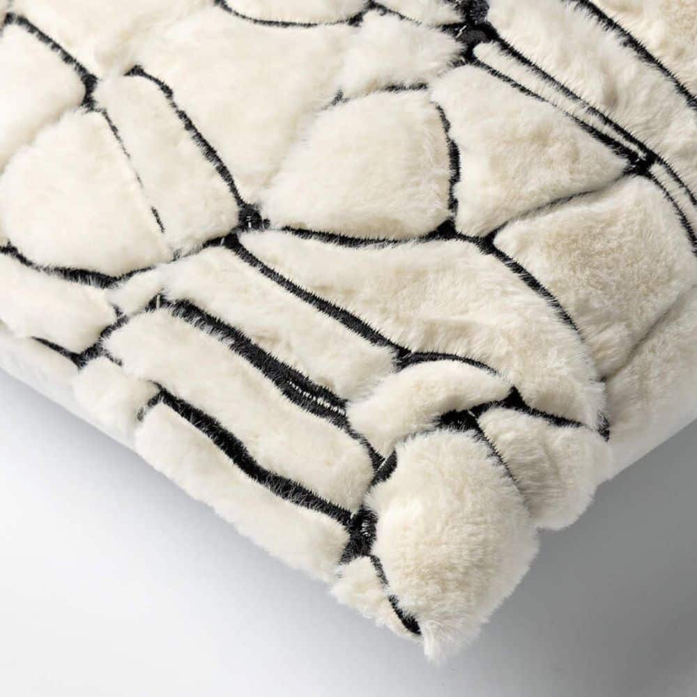Vaalean sävyinen sisustustyynynpäällinen, jossa musta epäsäännöllinen tikkaus. Musta tikkaus luo pehmoisen pörröiseen päälliseen hauskan graafisen kuvioinnin.