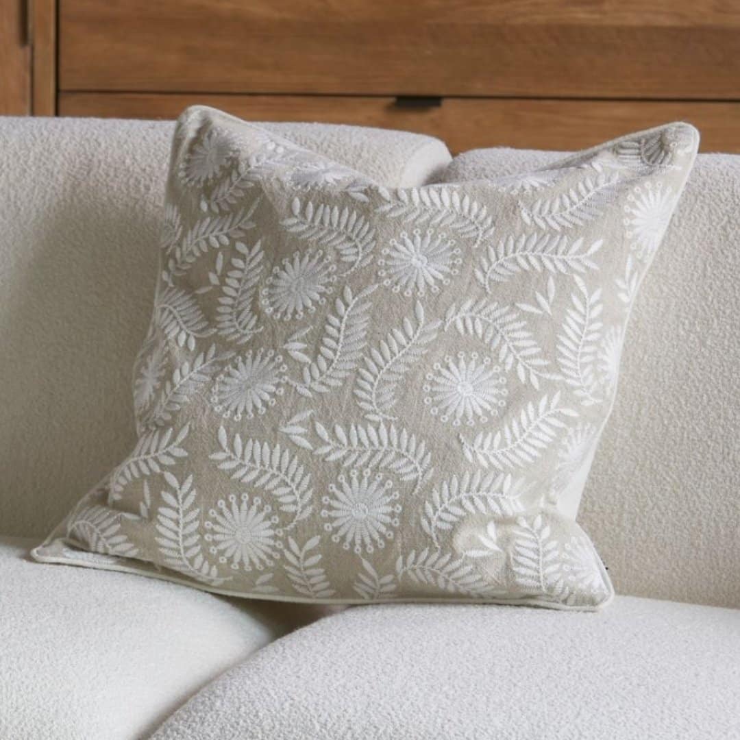 Sunbury Pillow Cover 50×50 Rivièra Maison – kaunis tyynynpäällinen, jossa kukkakuviointia edessä. Tyynynpäällinen on vaalean beige ja kukkakirjailu on valkoinen. Yhdistä yksiväristen sisustustyynyjen ja pehmoisen viltin pariksi!